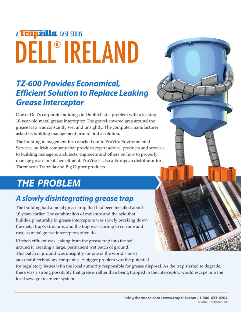 Problem: One of Dell’s corporate buildings in Ireland installed a metal grease trap 10 years ago. The combination of moisture and acid that naturally builds up in grease interceptors was corroding the metal trap. As the trap starts to degrade, there is a strong possibility that grease is entering the local sewage treatment system, putting Dell at risk for regulatory issues.